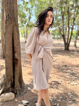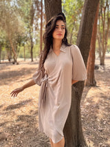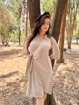 שמלה בגזרה נשית מחמיאה עם קשירה צדדית שמדגישה את קו המותן. עשויה מבד רך ונשפך, נעים למגע וקל ללבישה לאורך כל היום.